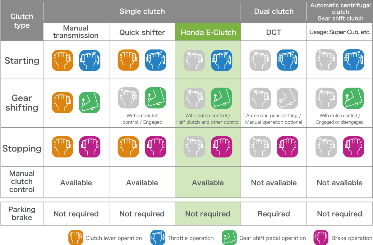 本田於其大型 FUN 電單車系列中採用獨特的雙離合器變速箱(DCT)。DCT 是一種自動變速系統,騎士無需操作離合器桿即可完成自動換檔。與之相比,本田 E-Clutch 屬於手動變速系統,僅自動控制離合器的操作,而換檔的控制權始終掌握在騎士手上。因此,離合器與變速機構本身與傳統手排變速車輛所使用的機構無異。
