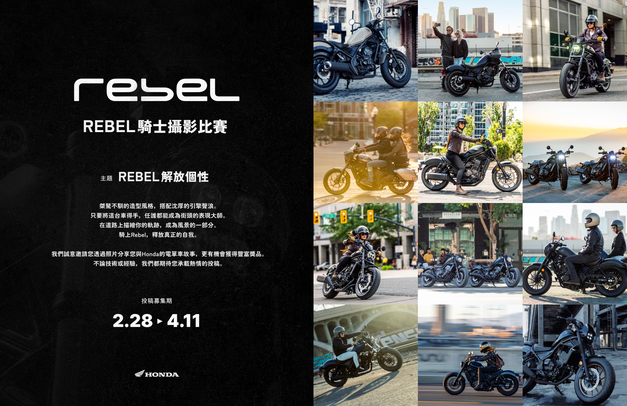 - 參賽作品需含有至少一台以下Honda車型ーーRebel250/300/500/1100或Rebel (MC13)。