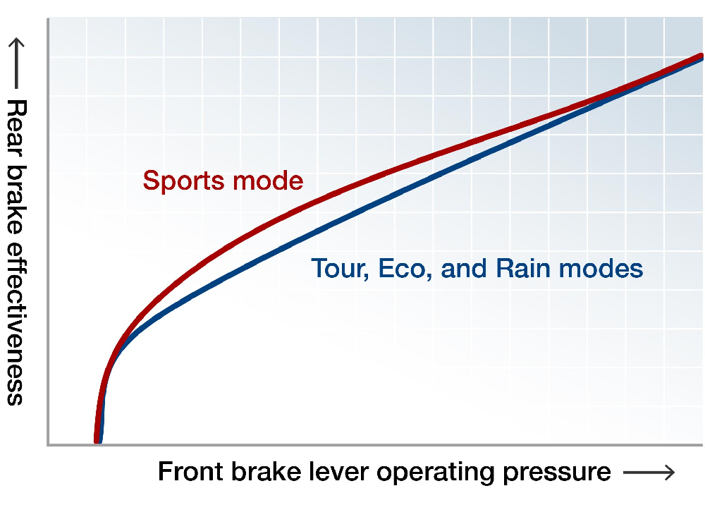Honda Gold Wing 上配備的「場景特定騎行模式」允許用家按照不同騎乘場景及路況設置相應的騎乘感,而煞車感受亦會隨之改變。Tour、Eco及Rain模式提供穩定的煞車體驗,而Sport模式則透過提升操作前拉桿時後煞車的初始反應,防止車頭過度前傾。即使後煞車的初始效能會隨模式改變,全力煞車時的最大煞車力度仍然保持不變。