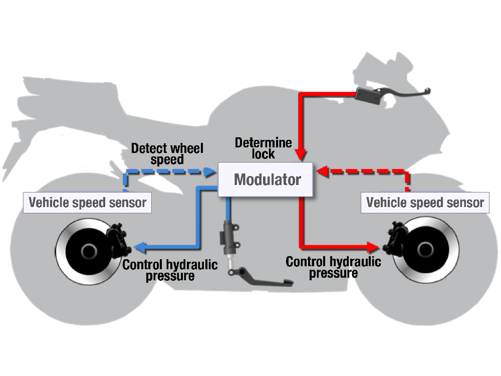 ABS 透過安裝於前後輪的感測器監測各自的轉速,當兩者之間出現差異時,系統會判斷轉速較慢的輪胎已被鎖死。對於鎖死的輪胎,系統會暫時釋放煞車以恢復轉速,然後再次施加煞車。此過程以1/1000秒為單位重複進行,以確保煞車力道並維持車輛穩定性。本田提供多種 ABS 系統,可依不同車型及騎士需求進行選擇。