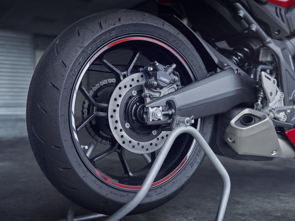 鋼製菱形車架提供核心剛性,帶來卓越的全方位操控特性。前角設定為 25.5°,拖距為 100 毫米,軸距則為 1,450 毫米。41 mm Showa SFF-BP 倒立式前叉和 Showa 後避震器提供高品質的懸吊控制。煞車方面,前煞車採用四活塞徑向前煞車卡鉗,搭配 310mm 浮動碟盤。前後鋁合金車輪分別配備 120/70-ZR17 與 180/55-ZR17 輪胎。