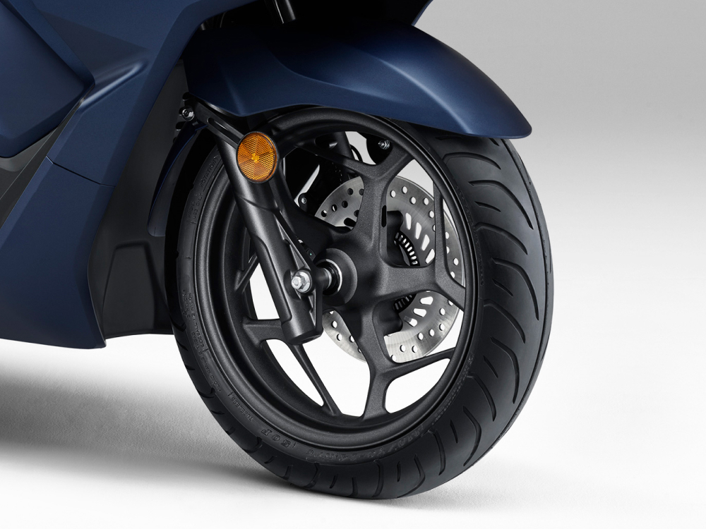 前後輪均配備ø220mm大型碟煞,前煞車標配單通道ABS(Anti-lock Braking System)*防鎖死煞車系統,大幅提升煞車時的安全感。14吋前輪與13吋後輪具備最佳化剛性平衡,Y型五輻輪圈設計營造出豪華感及敏捷乘坐體驗。寬輪胎則有助提升行駛穩定性,並為騎士提供舒適的騎乘體驗。