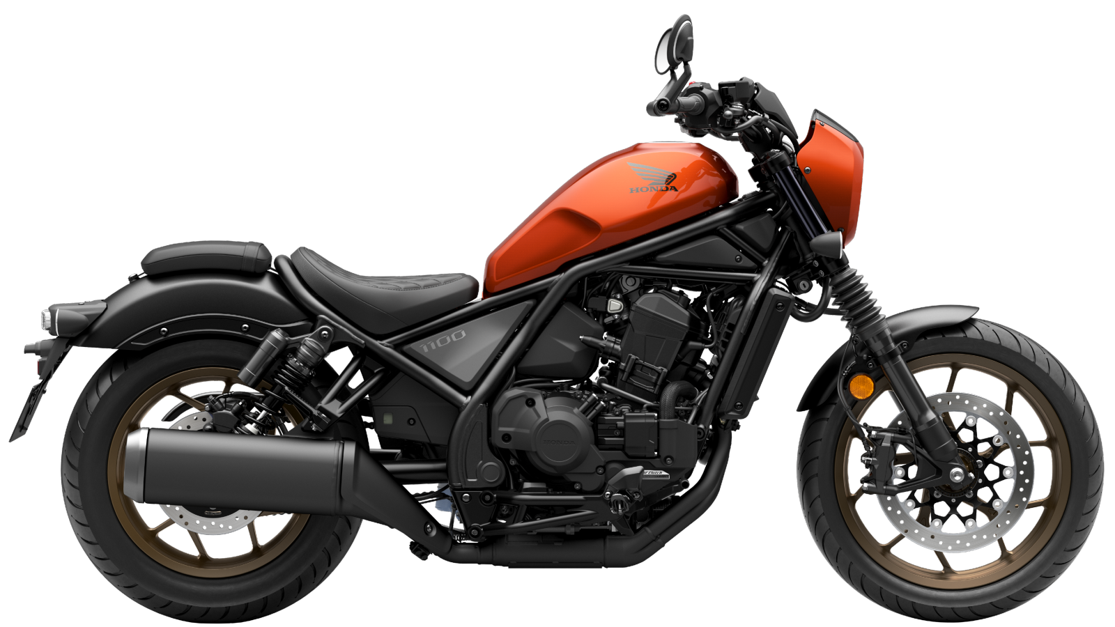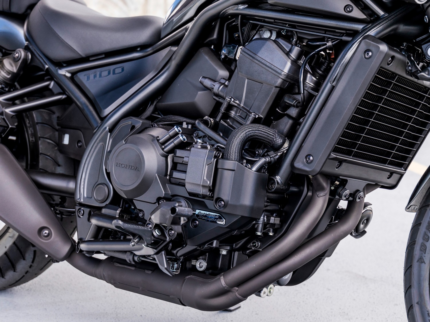 源自CRF1100 Africa Twin的1084cc直列雙缸水冷引擎為Rebel 1100注入媲美運動車型的卓越性能——最大馬力及扭力分別達65kW@7,250rpm及98Nm@4,750rpm。2025年款起進一步將壓縮比(由10.1)提高至10.5:1,強勁扭力在低轉速下即能盡數釋放,在廣泛轉速範圍內均可提供強大的動力輸出。Unicam® 引擎設計令引擎體積更緊湊,並改善整車的重心分佈。雙軸平衡設計則可消除引擎的慣性振動及耦合振動,進一步提升引擎的安穩度,令騎士操控更自如。