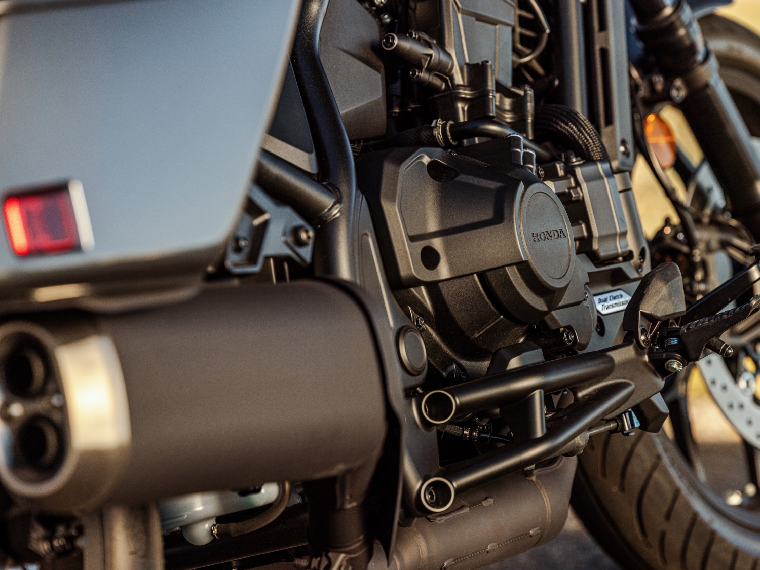 有別於在一般並列雙缸引擎上使用的180度曲軸,Rebel 1100將曲軸角度設定於270度。配合定製飛輪、特別調校的氣門開合時間,以及不均勻的點火間隔,營造出具脈動感的排氣聲浪,並經由啞黑色排氣管傳遞給騎士。在低轉速下,您能夠透過低頻迴響感受到引擎對每次油門扭動的響應;隨着轉速提升,引擎聲浪亦會隨之變得高亢。沉實的排氣聲浪為您的每趟旅程增添獨特韻味。
