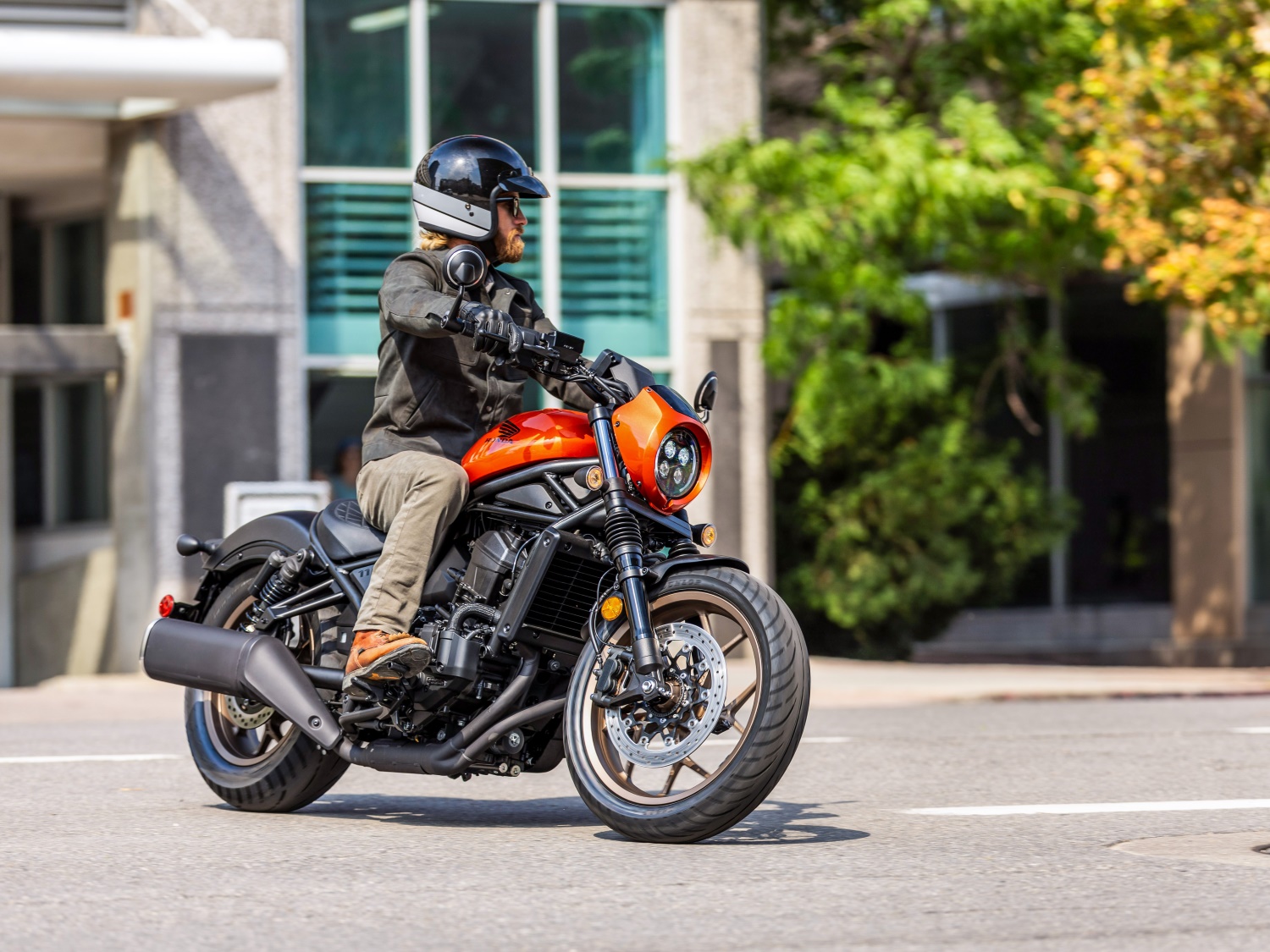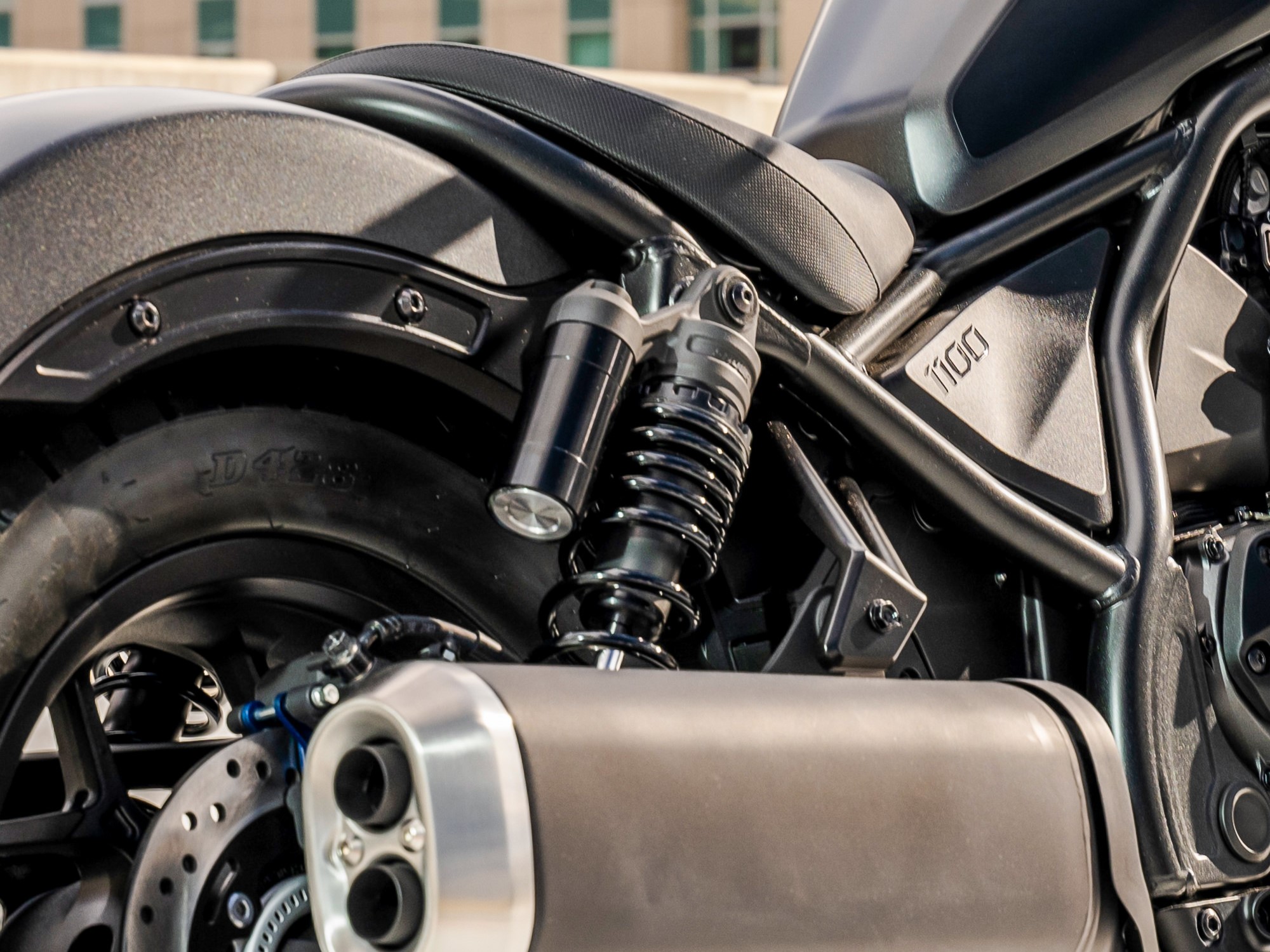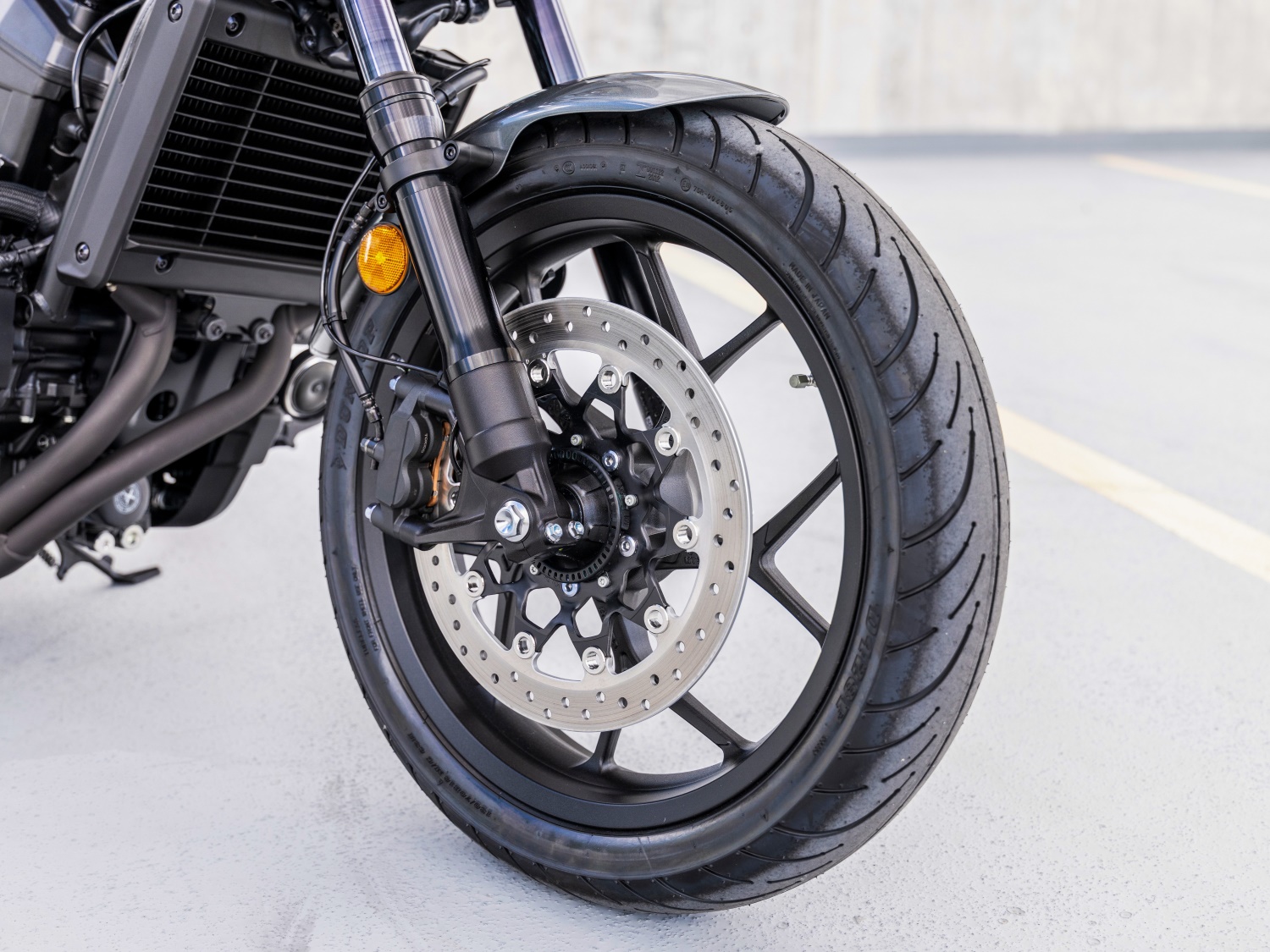 前煞車採用徑向安裝四活塞卡鉗,搭配直徑330mm的浮動剎車碟;後輪則配備256mm剎車碟。兩者均搭載ABS防鎖死煞車系統,在不同場景下皆能提供強大而穩定的制動力。前輪尺寸為130/70-18,後輪則採用更寬的180/65-16,有助提升抓地力。前後輪圈均由鑄鋁製成,並採用Y型五幅設計,鋭利且具運動感,完美結合Rebel的卓越操縱性與獨特設計美學。