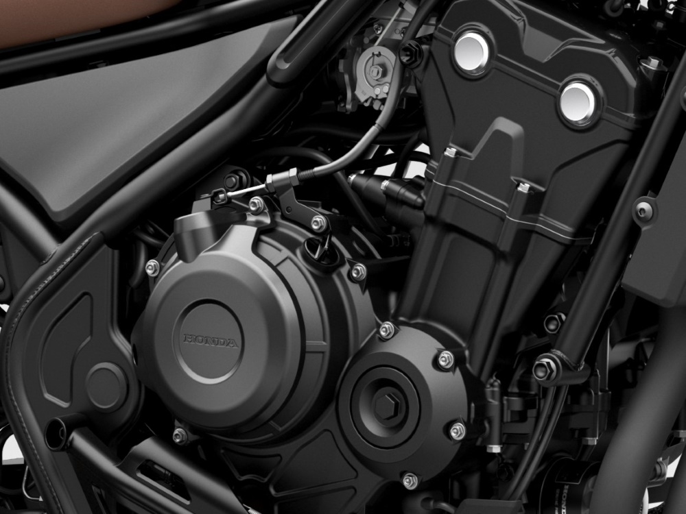 Rebel 的 471cc 8V冷並列雙缸引擎與 CBR500R相當。 針對巡航車定位,PGM-FI 燃油噴射設定、氣門開合及點火時機經過修改,車輛特性重視低轉速的扭力表現,提供平穩和線性的輸出。 6,000rpm 時最大扭力為 43.3Nm,最大馬力為34kW/ 8,500rpm。採用Assistance&Slipper®離合器,可減輕離合器桿的操作負載,並減少因引擎突然煞車而引起的後輪跳動。