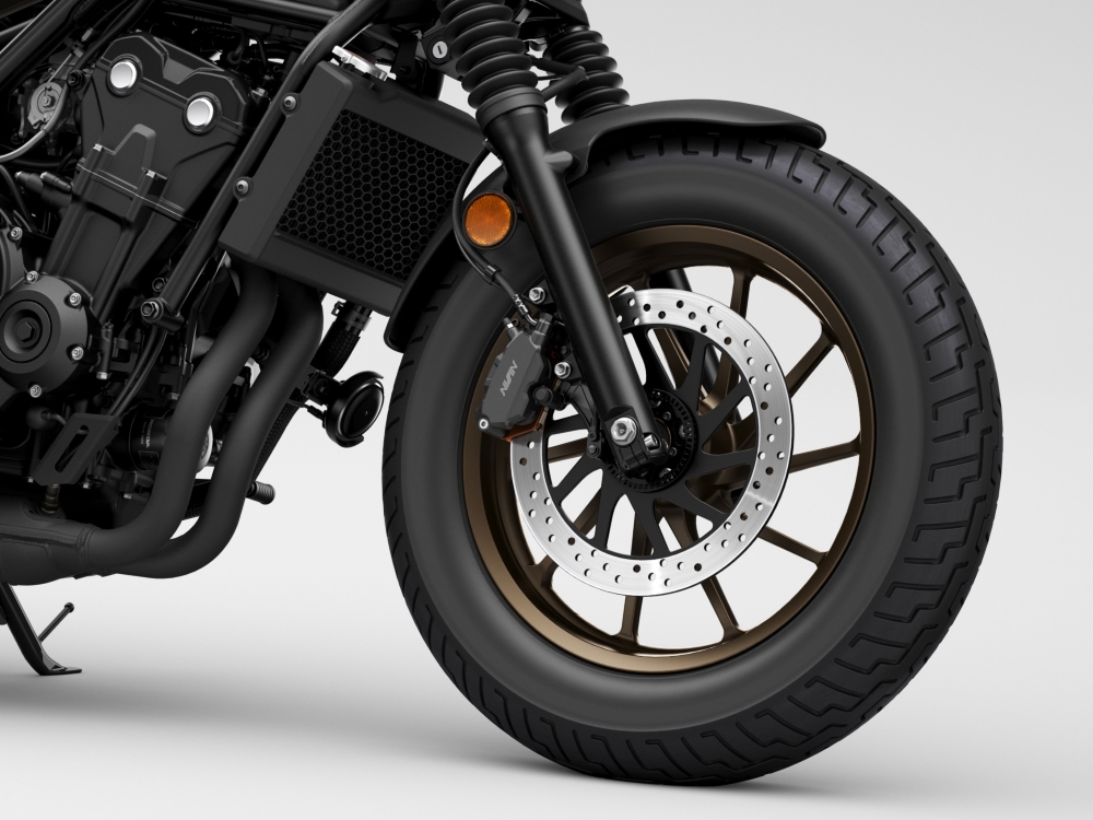輪胎採用標準尺寸前130/90-16、後150/80-16的Dunlop輪胎,16吋鑄鋁輪圈造型簡潔明快,296mm前煞車碟盤與輻條圖案相呼應,寬大的「Bobber」式輪胎與前雙活塞卡鉗完美搭配。雙通道系統 ABS* 煞車為標準配備。